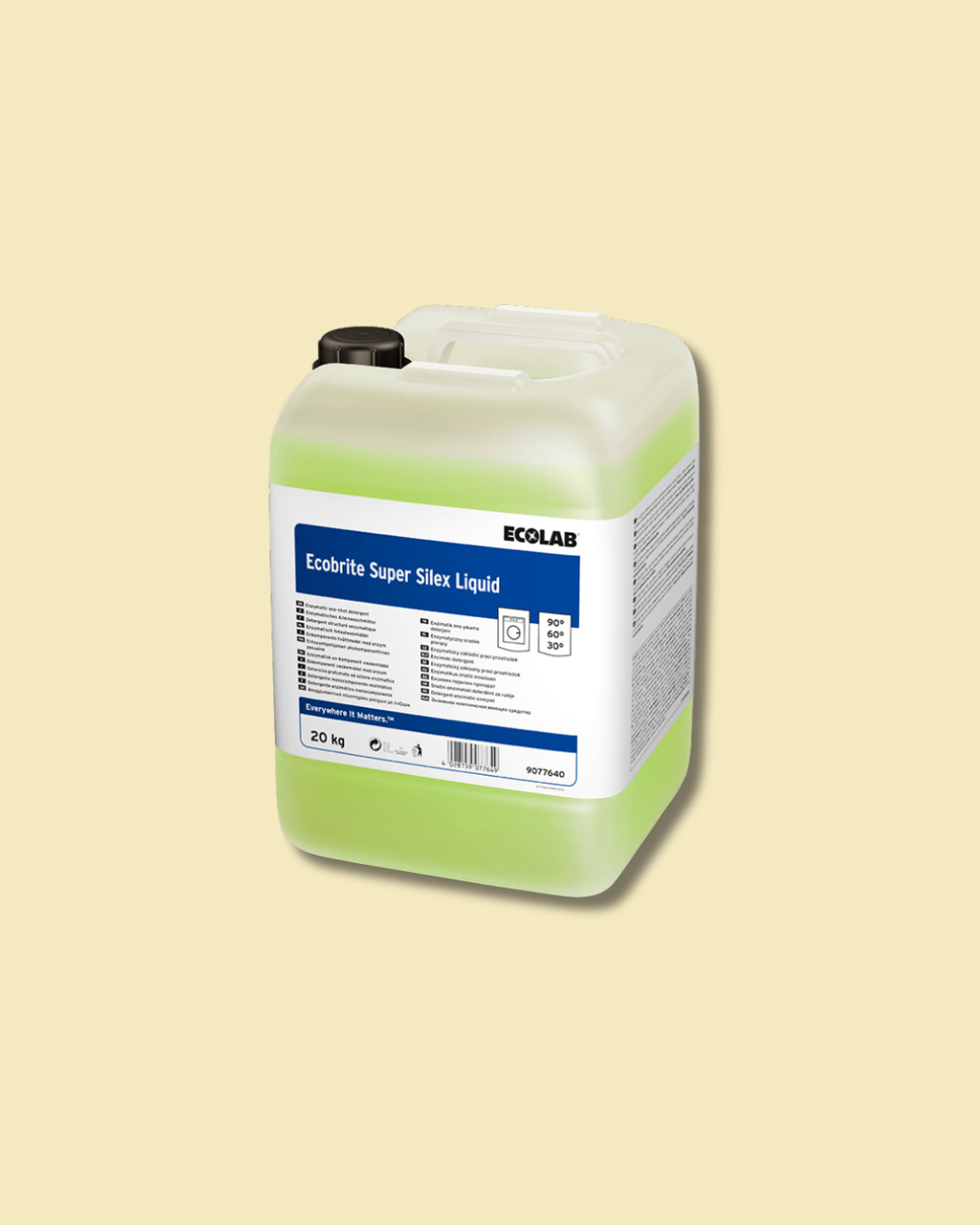 Ecobrite Super Silex Liquid ist ein hellgrünes, flüssiges Textilwaschmittelkonzentrat mit einem pH-Wert von 8,0–9,0 und bietet eine hochkonzentrierte Lösung für die professionelle Textilpflege. Das enzymatische, parfümierte Waschmittel wurde speziell entwickelt, um hartnäckige Verschmutzungen zuverlässig zu beseitigen. Es entfernt gezielt Fett-, Öl- und Proteinflecken wie Saucen, Kaffee, Ei oder Blut. Weiße Textilien erhalten neue Leuchtkraft, während der exklusive Duft für ein Gefühl von Frische und Sauberkeit sorgt.