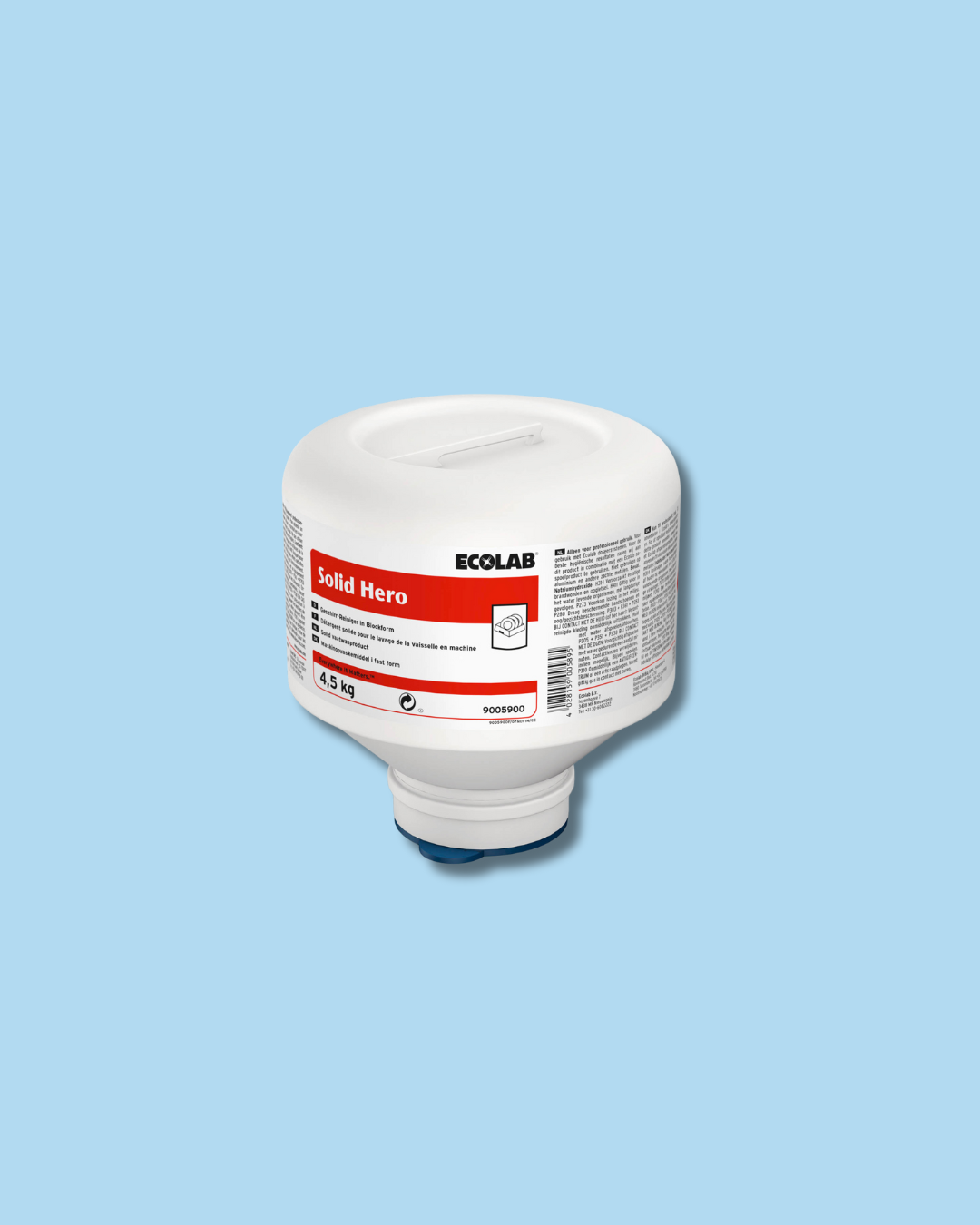 Solid Hero ist ein hochkonzentriertes Maschinenspülmittel mit Chlor und Phosphat, das auch bei sehr hohen Wasserhärten zuverlässig eingesetzt werden kann. Die innovative NCT® (Natural Cleaning Technology) schützt die empfindlichen Inhaltsstoffe, erhöht die Ergiebigkeit und sorgt dafür, dass starke Verschmutzungen bereits in einem Spülgang effektiv entfernt werden.