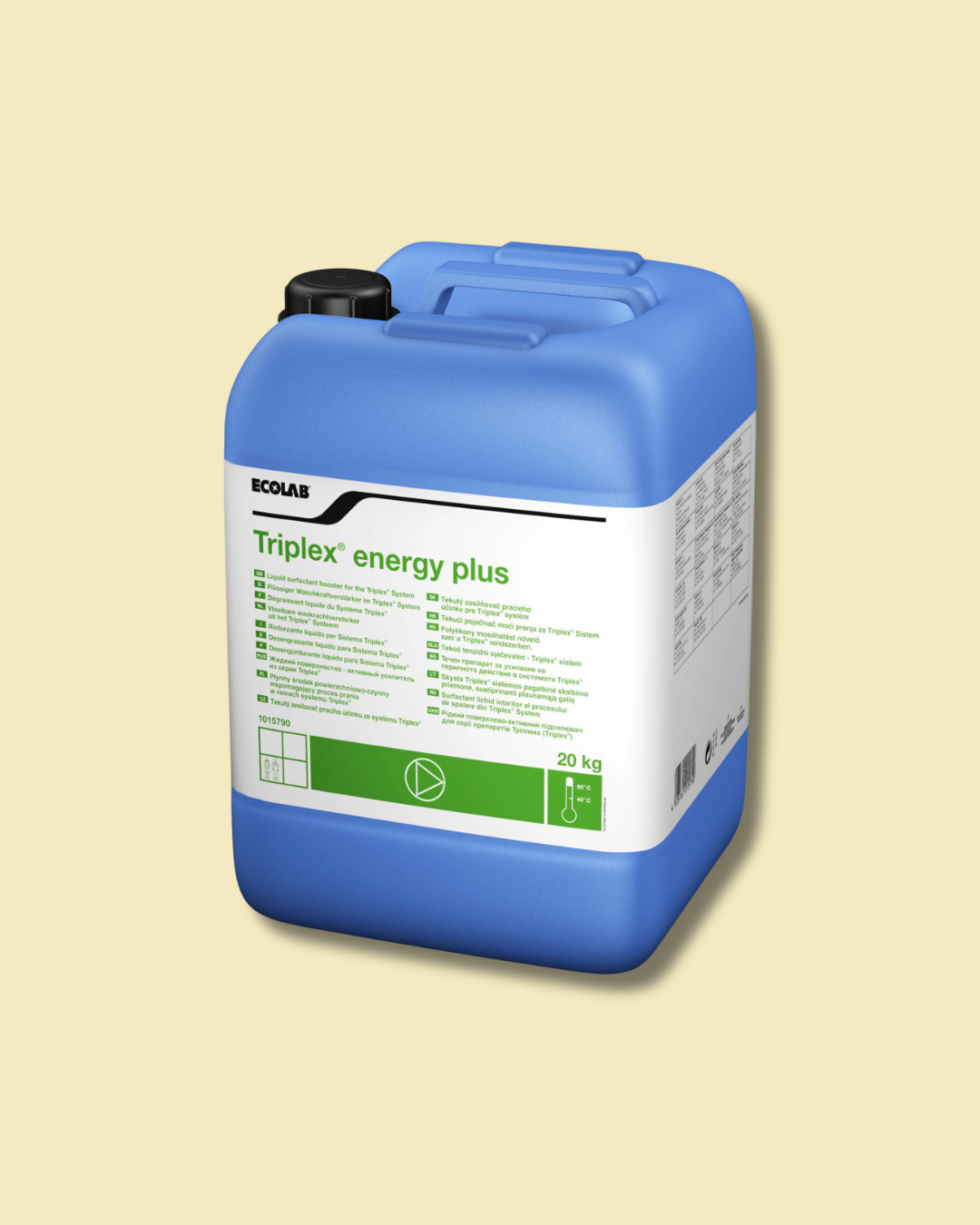 Triplex Energy Plus ist ein flüssiger Waschkraftverstärker für weisse und farbige Berufskleidung aus Baumwolle und Baumwoll / Polyester Mischungen. Er ist geeignet für den Temperaturbereich von 55 °C bis 70 °C.